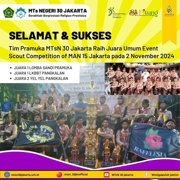 Selamat dan sukses Pramuka MTsN 30 Jakarta raih juara umum di event Scout Competition of MAN 15 Jakarta, pada 2 November 2024